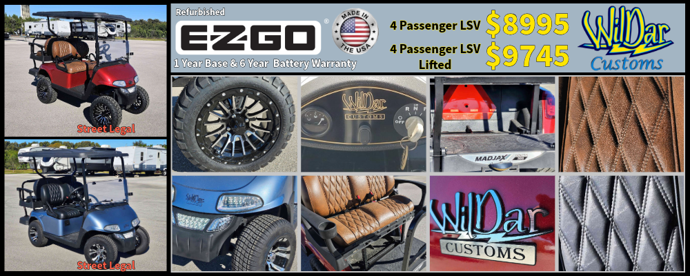 Made in America means High Quality, Hard Work, and Integrity! Introducing Wildar Customs – our very own line of deluxe customized golf carts! Wildar Customs are Made Right, Right Here in Ft Pierce, Florida on E-Z-GO’s highest quality RXV Elite chassis built to last and be repairable for long lasting enjoyment. Wildar Custom’s come in 2 Passenge...